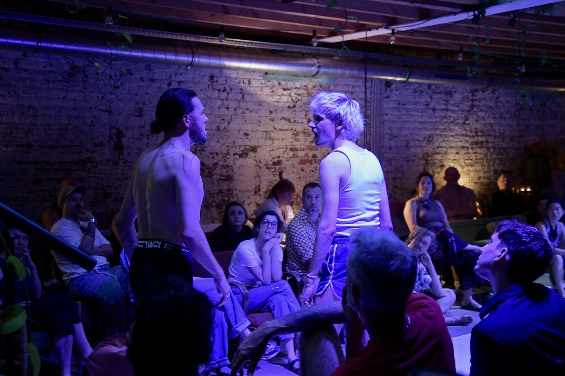 Pornopera is a concert stripped to its core: voice and body. Two singers and an electronic musician confront the audience with the physicality of sound. Early music meets the gaze of the present. What happens when music once meant for God enters the realm of arousal? When divine ecstasy pulses through bodies instead of belief? Performed on the shortest night, as daylight fades and the eye releases, the ear takes over. The audience surrounds the performers. The concert becomes an act of listening and exposure. Of desire, discipline, surrender, held in the grip of the minor second.